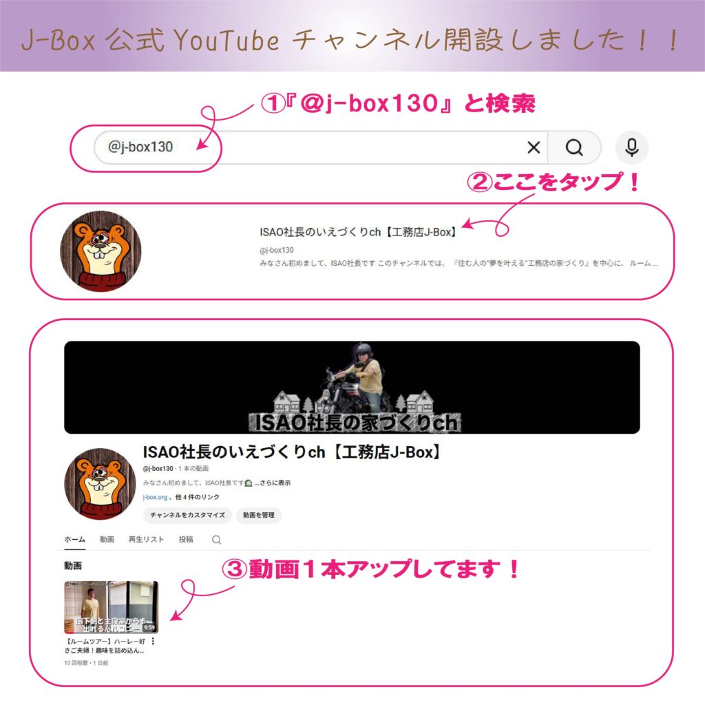 チャンネル名は、“ISAO社長のいえづくりch【工務店J-Box】”です😊